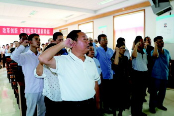 “作为一名医疗工作者,我正式宣誓:把我的一生奉献给人类;我将首先考虑患者的健康和幸福;我将尊重患者的自主权和尊严……”活动伊始,党委书记侯春生带领医师代表登台重温《希波克拉底誓言》,誓言遵守医生对患者、对社会的责任及医生行为规范。一字一句,入脑入心,响亮的宣誓声音回荡在会议室里。