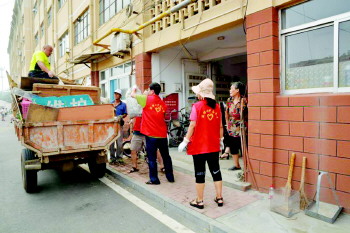 本报讯 近日,淄博七中14名教职工志愿服务者在辛安社区负责同志的带领下走进淄建第九生活区,清理走廊和楼道里堆积的废弃物,帮助居民重建通畅舒适的生活环境。