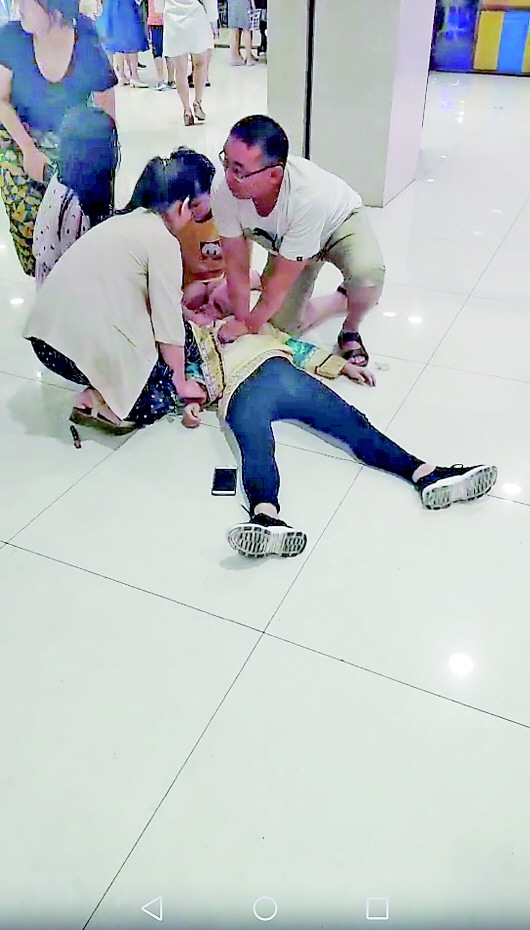 8月18日晚,聊城市城区一家商城内上演生死救援,一名年轻女子突然晕厥倒地,路过的数名医务人员跪地接力救援。