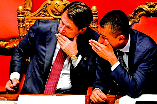 20日,在意大利罗马,意大利总理孔特(左)在参议院发表讲话后与副总理兼经济发展、劳工与社会政策部长迪马约交谈。 新华/法新