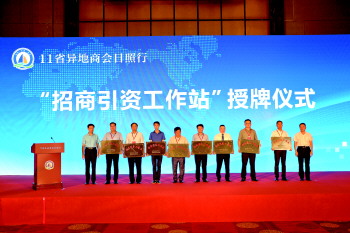 为宣传推介日照市的发展环境和优势资源,开展招商引资和经济合作活动,8月21日,由日照市人民政府主办,中共日照市委统战部、日照市发改委、日照市工商联、日照市招商投资促进中心承办的“11省异地商会日照行”推介会在岚桥锦江大酒店举行。同时,会议上为“招商引资工作站”授牌。