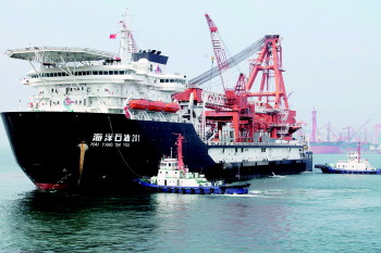 我国首艘深水铺管起重船“海洋石油201”从青岛西海岸新区解缆起航。(资料片)