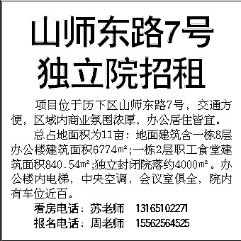 山师东路7号 独立院招租 项目位于历下区山师东路7号,交通方便,区域内商业氛围浓厚,办公居住皆宜。 总占地面积为11亩:地面建筑含一栋8层办公楼建筑面积6774㎡;一栋2层职工食堂建筑面积840.54㎡;独立封闭院落约4000㎡。办公楼内电梯,中央空调,会议室俱全,院内有车位近百。 看房电话:苏老师 13165102271 报名电话:周老师 15562564525