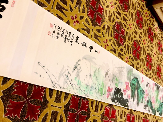 细观此幅长卷,开题“清殿遗风”后,一池荷花的美丽景象就徐徐展开,通过画面中对荷花及叶子的表现来看,在创作时,他充分运用了宣纸的渗墨特性,把深浅不一的墨块横涂竖抹,变幻莫测,气象万千。在大片泼墨、泼彩形成荷叶之后,他再补以花瓣、荷茎、浮萍等,构成色块与线条的互动。在整幅画面中,他还运用了泼墨、积墨等手法,营造出水墨变幻之境,浓、淡、干、湿,自然渗化,不由得让人联想到李义山的诗句“留得残荷听雨声”,使观者徜徉在一片无尽的诗意中。