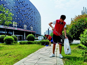自济宁高新区全面开展全国文明城市创建活动以来,济宁科技馆也积极参与到各项创城工作中来。通过将创城元素融入科普活动,全员参与维护环境卫生等方式,向往来游客传递文明,助力创城。如今,科技馆的创城氛围更浓了,市民参观游玩也越来越舒心。日前,记者走进济宁科技馆,亲身感受到了浓浓的创城氛围。图为科技馆外,志愿者们正在打扫卫生。