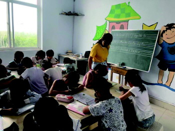五莲县潮河镇“四点半”学校志愿者老师给孩子辅导作业。