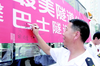8月28日,交运温馨巴士隧道分公司组织开展“规范行车,文明驾驶,从我做起,做文明公交驾驶员”活动,驾驶员签字从我做起。交运温馨巴士隧道分公司经理李祥介绍,活动期间,邀请市民来监督公交驾驶员文明驾驶行为,对有效并采用意见的乘客,可以获得精致小礼品。