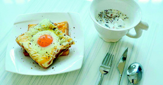 做法:1)咸吐司,一面抹上黄油。2)中间放一个洋葱圈。3)在洋葱圈中打入一个鸡蛋。4)烤箱上火预热170度,烤5分钟关火,焖1至2分钟。5)烤好的太阳蛋。