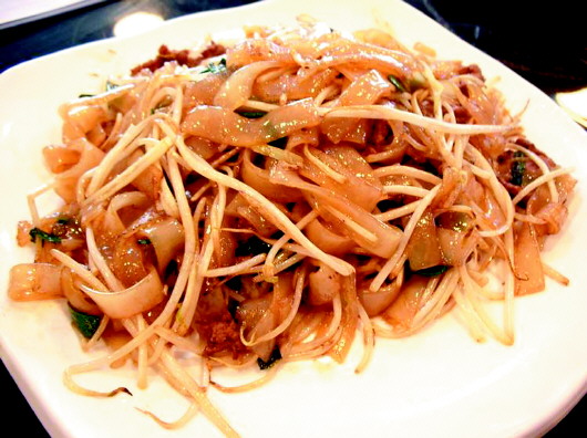 做法:1)锅里倒入比平常炒菜多的橄榄油,先放入姜片、葱白炒出香味即盛出待用。2)转慢火倒入腌过的牛肉翻炒,炒至变色盛起待用。3)倒入沙河粉转大火翻炒,边炒边撒入用生抽、清水、糖、鸡精调成的汁。4)炒均匀之后把牛肉重新加入一起翻炒。5)放入葱段翻炒熄火。