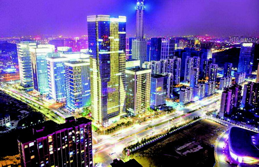 高新区汉峪金谷夜景“点亮”了经十东路。汉峪金谷片区以金融办公、企业总部和配套商业为主。(资料片)