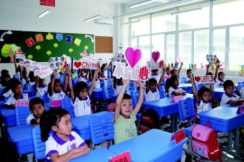 小学新生们坐于崭新的教室内,迎接新学期。