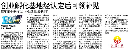 记者从济南市公共就业服务中心获悉,2019年1月1日后,经济南市人社部门认定或复审认定的创业孵化基地(园区)可领创业孵化补贴。
