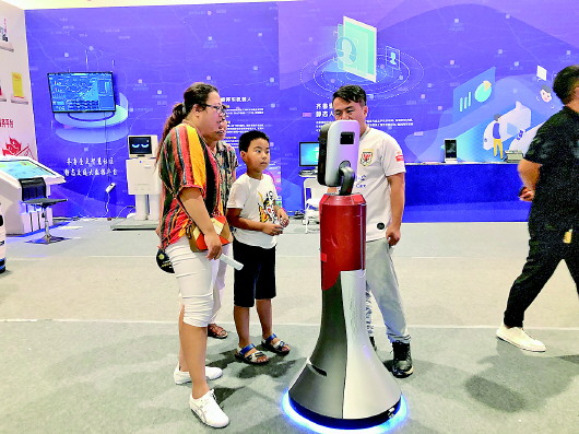 2019齐鲁秋季房展会上,市民与齐鲁壹点智能机器人互动。