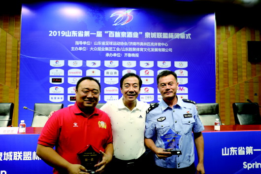 9月6日,2019山东省第一届“百脉泉酒业”泉城联盟杯职工足球联赛闭幕式,在济南奥体中心新闻发布厅举行。山东省足协秘书长、山东省足球运动管理中心主任马军鸣,齐鲁晚报总经理张天卫,山东省足协副会长、济南市体育局副局长吴志东出席了闭幕式,并为获奖的参赛球队颁奖。此次“泉城联盟杯”受到亚足联、中国足协的关注和赞扬,被亚足联纳入2019“草根足球节”的一部分。