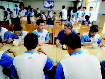 校长与学生共进午餐,听取学生对校内就餐的意见。