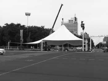11日,记者在北海路东风街路口看到,工人们正在安装张拉膜遮阳棚,路口东侧两个遮阳棚已经安装完成,西侧两个正在施工。现场负责人任洪樟表示,北海路东风街因改完后路口大,市民过街等待时间长,为了便民,增加了四个白色张拉膜遮阳棚,一个张拉膜遮阳棚接近400公斤的拉力,美观实用。