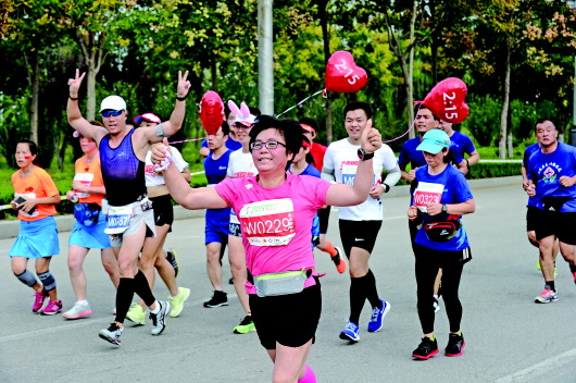 ◤齐河马拉松比赛共吸引4000余名国内外选手报名参与,涉及各个年龄层。图为一名选手向镜头竖起大拇指。