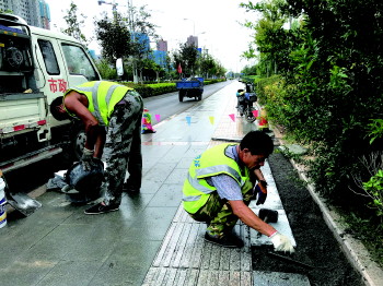 同样,在京杭路与车站南路交叉口,几名工人正在修补人行道上的地砖。“这里的地砖被轧坏了,正在进行翻修,大概四天就能完工。”山东华圣瑞德市政工程有限公司现场负责人李振坤介绍,他们主要负责运河路以东所有的市政基础设施的维护,包括人行道、路缘石、护栏、井盖、雨水箅子等,在其负责区域内共有井盖1800多个,雨水篦子3000多个,都需要定期检修。在京杭路上,工人正在铺设人行道石板。据介绍,像这样的工程,每个月要铺1500平方米。