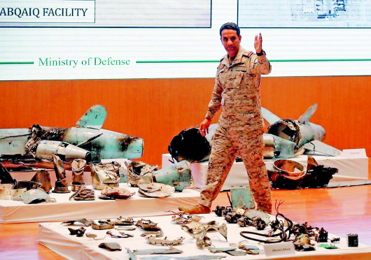 18日,沙特国防部召开新闻发布会,展示伊朗“攻击”沙特石油设施的无人机残骸和导弹碎片,称这是“无可否认”的证据。