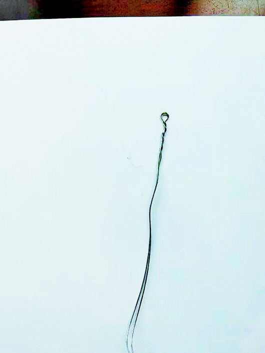 李元明说,铁丝头正好卡在了外耳道狭窄的地方,如果卡的时间过长,水肿将会更加严重,取出也会更困难。“我和一起值班的马启魁主治医师、张静副主任护师把铁丝固定住,在耳内窥镜下,轻轻地将铁丝旋转90度,用了一分钟左右,很轻松就把铁丝取了出来。好在铁丝没有损伤女子的听力。”