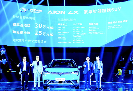 8月29日,以“引时代追随”为主题,广汽新能源旗舰车型Aion LX(埃安LX)在北京雁栖湖国际会展中心以一场科技盛宴拉开了其上市预售的序幕。Aion LX是全球领先的超级智慧体,拥有650km NEDC续航性能,全球第一,以及3.9秒的百公里加速性能,可媲美豪华超跑,是一款具有里程碑式意义的“豪华智能超跑SUV”。活动现场,Aion LX预售价格正式揭晓,其中两驱基准版补贴后预售价格为25万元起,四驱基准版补贴后预售价格为30万元起。