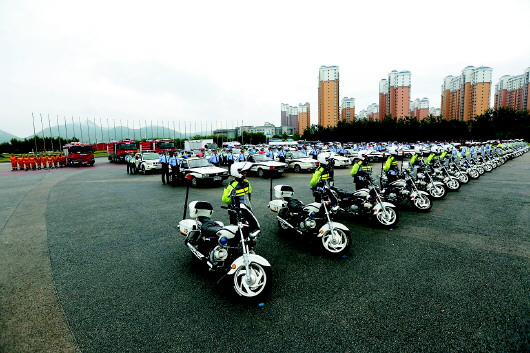 随后,现场警用摩托车方阵、巡逻警车方阵、大型警用车辆方阵依次驶向辖区主干街道,统一进行武装巡逻。
