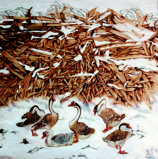 烙画又称烫画,火笔画,中国传统艺术珍品,用火烧热烙铁在物体上熨出烙痕作画。烙画创作在把握火候和力度的同时,注重“意在笔先、落笔成形”。烙画不仅有中国画的勾、勒、点、染、擦、白描等手法,还可以烫出丰富的层次与色调,具有较强的立体感,酷似棕色素描和石版画,因此烙画既能保持传统绘画的民族风格,又可达到西洋画严谨的写实效果,具有独特的艺术魅力,因而给人以古朴典雅、回味无穷的艺术享受。