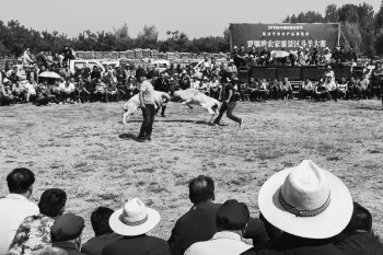 现场,除了品尝农产品,人气最旺的当属斗羊比赛了。“斗羊”是鲁西南一项传统的民俗文化项目。“Duang!”人山人海中,未见羊先闻声,两只羊头碰撞的声音,再加上观众不时喝彩,足以看出比赛的激烈。“55号羊气势很足……”主持人讲解着比赛,观众们也有自己的看法,经过几轮拉斗、“抵头”,55号羊依旧昂头挺胸,吓退了不少“胆小者”。