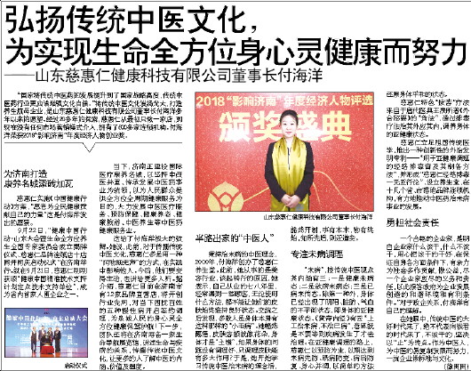 “国家将传统中医药的发展提升到了国家战略高度,传统中医药行业更应该增强文化自信。”将传统中医文化发扬光大,打造养生航母企业,是山东慈惠仁健康科技有限公司董事长付海洋多年以来的愿望。经过20多年的探索,慈惠仁从最初只做一家店,到现在没有任何市场营销模式介入,拥有了600多家连锁机构。付海洋荣获2018“影响济南”年度经济人物创业奖。