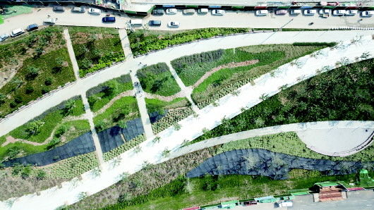 绸带公园一期规划总占地面积8.3万平方米,其中广场铺装约2.9万平方米,绿化栽植约5.4万平方米,主要包括种植、土方、铺装、景观浇灌、景观功能性照明、景观挡墙、水景、休闲座椅、自行车架、下沉绿地等。