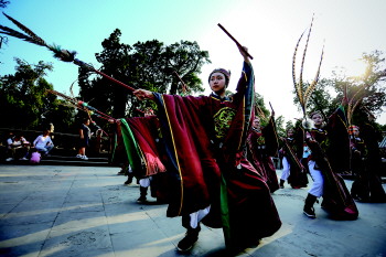 祭孔乐舞包括“宫悬之乐”、“八佾之舞”、“轩悬之乐”、“六佾之舞”及“登歌”等,所用乐器包括金、石、丝、竹、革、木、匏、土等八类,体现了孔子礼乐思想中的“和同”。整个祭孔乐舞庄严肃穆,舞姿雍容大方,古朴典雅凸显文化品味。
