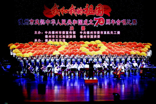 本报9月26日讯(记者 马志勇) 9月26日晚,“我和我的祖国”庆祝中华人民共和国成立70周年合唱比赛总决赛暨颁奖晚会在德州大剧院拉开帷幕,经初赛、复赛后,来自市直有关部门、单位,市属各国有企业以及各县市区共计12支队伍为“新中国70华诞”献歌。此次比赛由中共德州市委宣传部、中共德州市委市直机关工委、德州市文化和旅游局和德州市国资委主办,德州市文化馆承办。最终经过比拼,德城区代表队、德州德达城市建设投资运营有限公司代表队、德州广播电视台代表队获得一等奖。