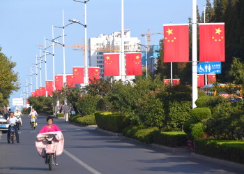 国庆将至,日照市区的一些主要道路两旁的路灯杆都挂上了国旗,五星红旗迎风飘扬,节日的氛围愈加浓厚。