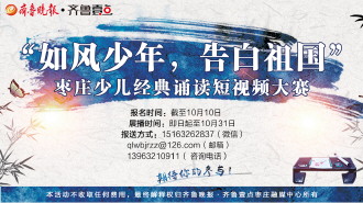 本报9月26日讯(记者 刘臣 吕档档) “如风少年,告白祖国”,日前齐鲁晚报枣庄融媒中心启动了枣庄少儿经典诵读短视频大赛活动,短短几天时间,受到了广大枣庄家长的关注和追捧,目前活动仍在报名中,时间截止10月10日,想要参加的小伙伴抓紧报名了。