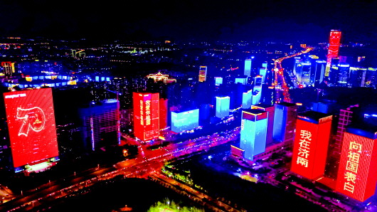 9月26日晚,济南经十路沿线的楼体亮起了五颜六色的彩灯,从空中看格外绚丽多彩。几栋红色的楼体分别打出“我爱你祖国”“我在济南,向祖国表白”等字样,祝福新中国成立70周年。