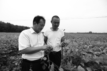 曹金平和曹中德在田间交流大豆种植心得。 齐鲁晚报·齐鲁壹点记者 孙逢辉 摄