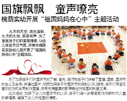 九月的天空,流光溢彩,九月的大地,笑语欢声,为了激发孩子们的爱国情感,让幼儿体验节日气氛,济南市槐荫区实验幼儿园开展了“祖国妈妈在心中”主题活动。