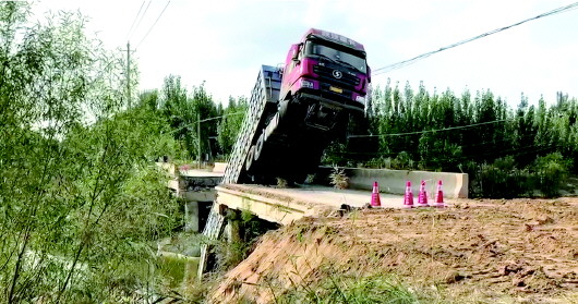 据悉,当天凌晨4点左右,一辆牌照为鲁MAN226的重型半挂货车沿渤海十八路由南向北行驶至市西办事处李茂家村附近,右转弯进入连接渤海十八路与李茂家村村西乡间路的一座宽4米左右的小桥时,致使桥面坍塌。