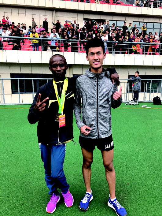枣庄17岁小伙郁权威(右)荣获男子半马第二名。