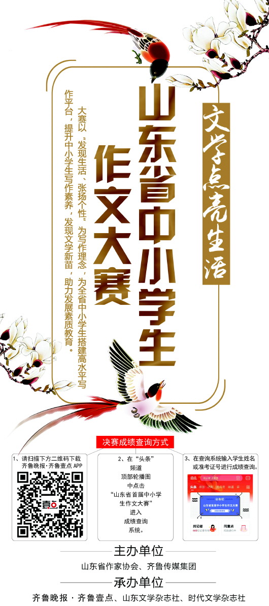 山东省中小学生作文大赛由山东省作家协会、齐鲁传媒集团主办,齐鲁晚报·齐鲁壹点、山东文学杂志社、时代文学杂志社承办,是一项服务于中小学生写作实践,引导中小学生进行写作创新性尝试的公益性作文竞赛活动,自2019年起每年举办一届,今年是第一届。首届大赛由新东方济南学校和百年育才(山东)联合冠名。
