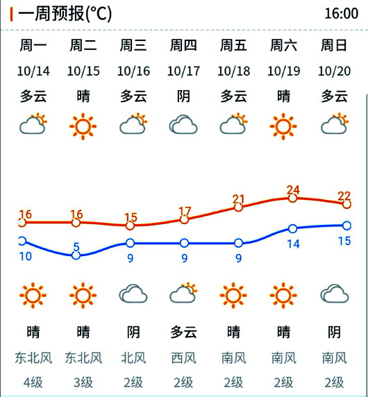 济南市气象台10月13日16时发布的近期天气预报:
