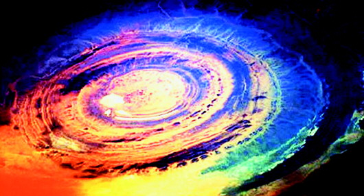 在撒哈拉大沙漠西南部毛里塔尼亚境内有个十分壮观的圆形地貌,直径为30英里,这就是有名的“撒哈拉眼”。最初人们以为是陨石落下地面形成的,但后来地质学家认为这是地面隆起并受到侵蚀的产物,至于圆形的成因仍然是个谜。