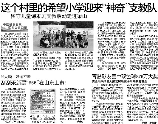 山东省福利彩票发行中心践行“扶老、助残、救孤、济困”的宗旨,从关注农村留守儿童入手,为他们解决实际困难和问题,为他们提供切实的帮助。通过“留守儿童课本剧支教暨汇演”活动,以一种全新的方式,演绎充满童趣、寓教于乐的经典课文,一方面弘扬传统文化,另一方面扩宽留守儿童课外艺术教育,在为留守儿童艺术素质和心理健康的发展方面起到了积极探索的作用。(苏柏)