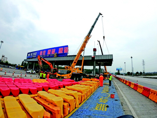 目前,2个ETC车道迁移、收费岗亭拆除、地下管线拆除均已完成,正在拆除部分雨棚、安装中央分隔带护栏,拆除后保留的立柱至道路中心线间距为15.1米,能够满足两个车道车辆通行需求。
