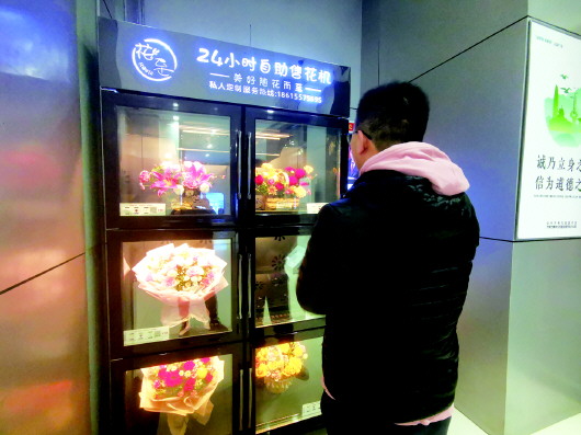 “快看,那边机器里有卖花的!”15日晚上,市民小李和朋友在燕山银座商城逛街时,被门口一个自助售花的机器所吸引。走近一看,不同类型的鲜花花束被分别放在各自柜子的单元格内。暖黄色灯光下鲜艳欲滴的新鲜花束,吸引了许多购物的市民上前观看。