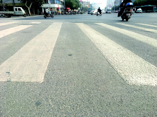 在济南市区,防滑的斑马线已经在不少路口出现。就在经九纬一路口向西,经九路和自由大街交叉口以及经九路和纬二路交叉口,存在的就是这种甩涂工艺施工的防滑斑马线。短短只有几百米的距离,为何不一样?