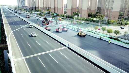 10月25日,华山高架桥正铺设沥青,济青高速改建工程年底将全线通车。