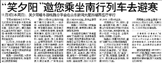 齐鲁晚报·齐鲁壹点“壹起游”俱乐部联合笑夕阳于11月3日上午9:00在山东新闻大厦四楼西岳厅,召开暖冬游线路分享会,在此邀请各位读者参加。