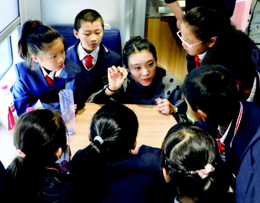 走出博物馆,少先队员们登上高铁亲身体验。车厢里,他们聆听了G190列车长田菲对复兴号动车组的介绍,并与车长互动;餐桌旁,少先队员们围坐在冯俐老师周围,听她解释高铁纪念币的意义。列车飞驰行进中,大家一起见证了高铁纪念币稳稳地立在餐桌上、空水瓶也稳稳地倒立在餐桌上,大家都被高铁的平稳、技术的成熟所震撼、所折服,也为祖国的强盛感到骄傲和自豪。少先队员们在候车大厅新中国成立70周年展台上,朗诵了一首毛主席诗词《水调歌头·重上井冈山》,慷慨激昂、铿锵有力,感染了在场所有人。