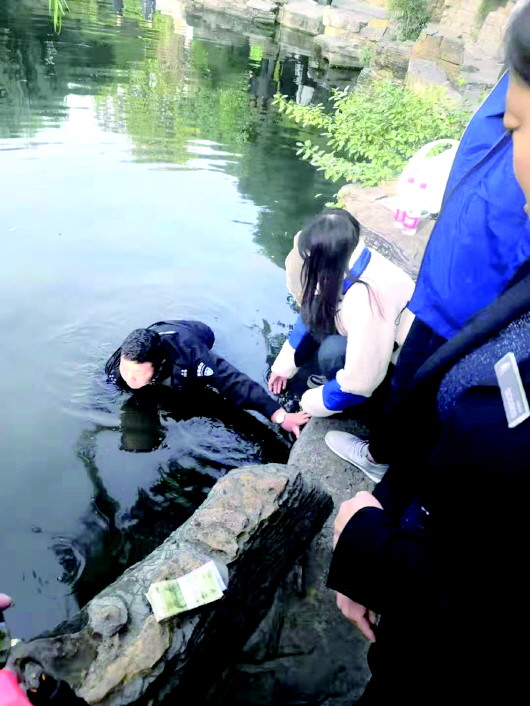 “我的手机掉下去了怎么办,可以下去拿吗?里面有很重要的资料。”宋女士第一时间向景区内的保安求助。“千万不能下去,您别急,我们拿专门的工具帮您打捞。”保安员于川连忙向宋女士解释。随后,于川与公园工作人员找来了钳子、捕网等打捞工具。